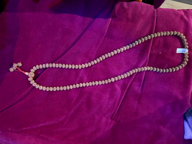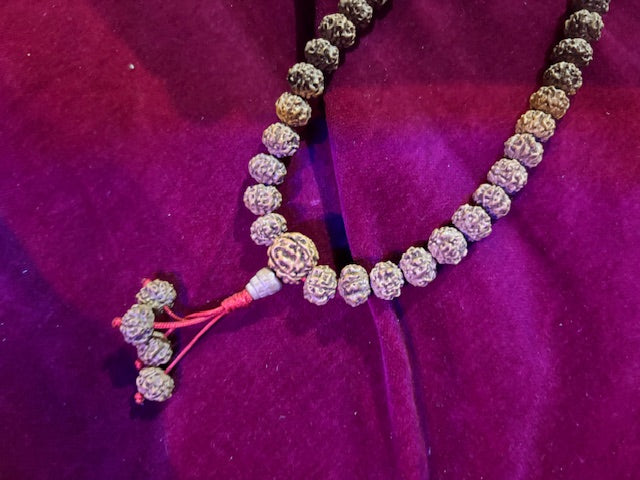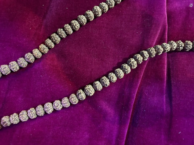 Beautiful crisp and clearly formed Rudraksha Mala beads are 7mm wide x 6 mm high Handmade in Nepal with lovely tassle of smaller beads at the end. Guru Bead is also a Rudraksha Bead.